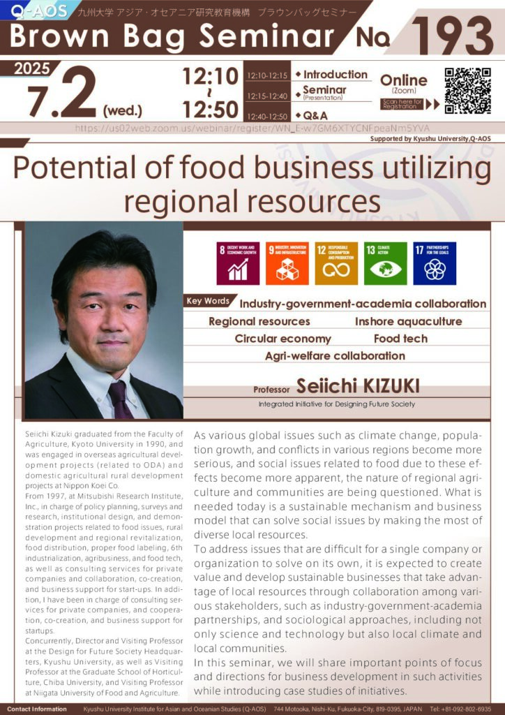Kyushu University Institute for Asian and Oceanian Studies (Q-AOS) organizes the “Brown Bag Seminar Series (BBS)” every Wednesday during lunchtime. These seminars aim to disseminate the latest research activities related to the Asian and Oceanian regions and the Sustainable Development Goals (SDGs), while providing a platform for interdisciplinary research networks and fostering exchanges among participants.