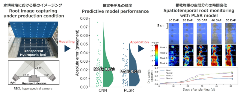 In this method, part of a hydroponic cultivation system is replaced with transparent materials, enabling observation of the entire root system. By applying a machine‑learning model*² based on the acquired spectral images*¹, the dry matter weight of roots can be estimated.