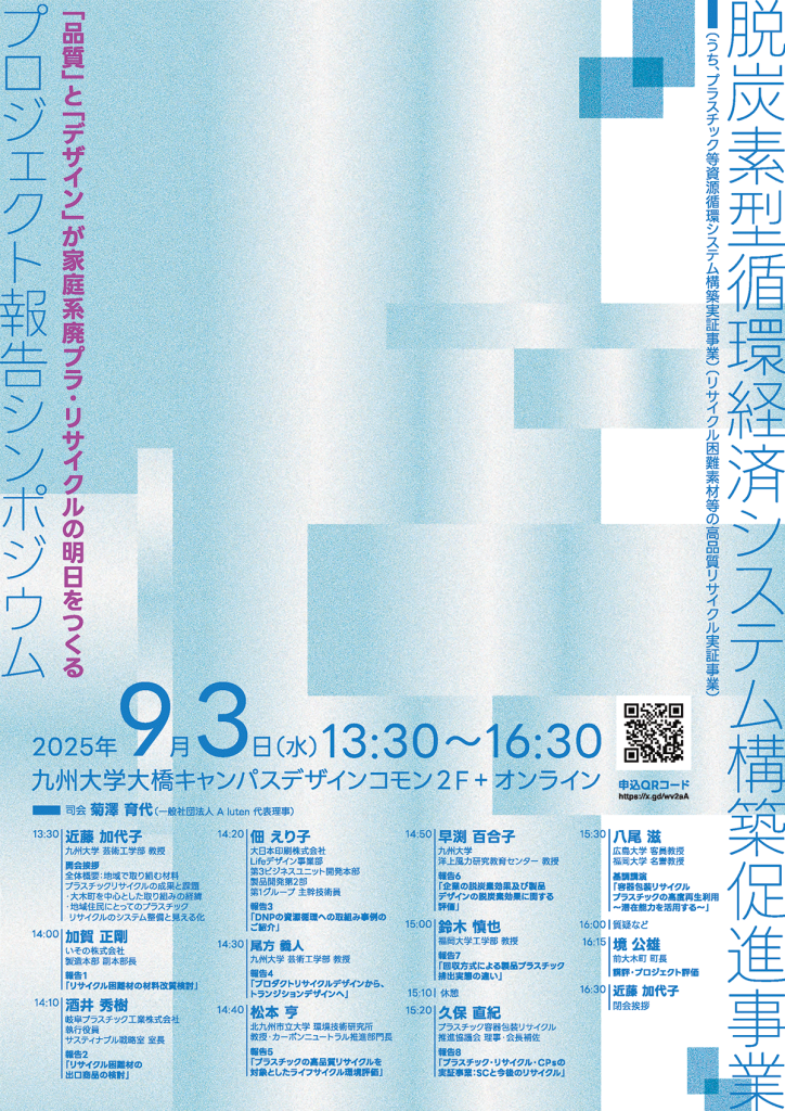 このたび、下記のとおりプロジェクト報告シンポジウム-「品質」と「デザイン」が家庭系廃プラ・リサイクルの明日をつくる-を開催いたします。
