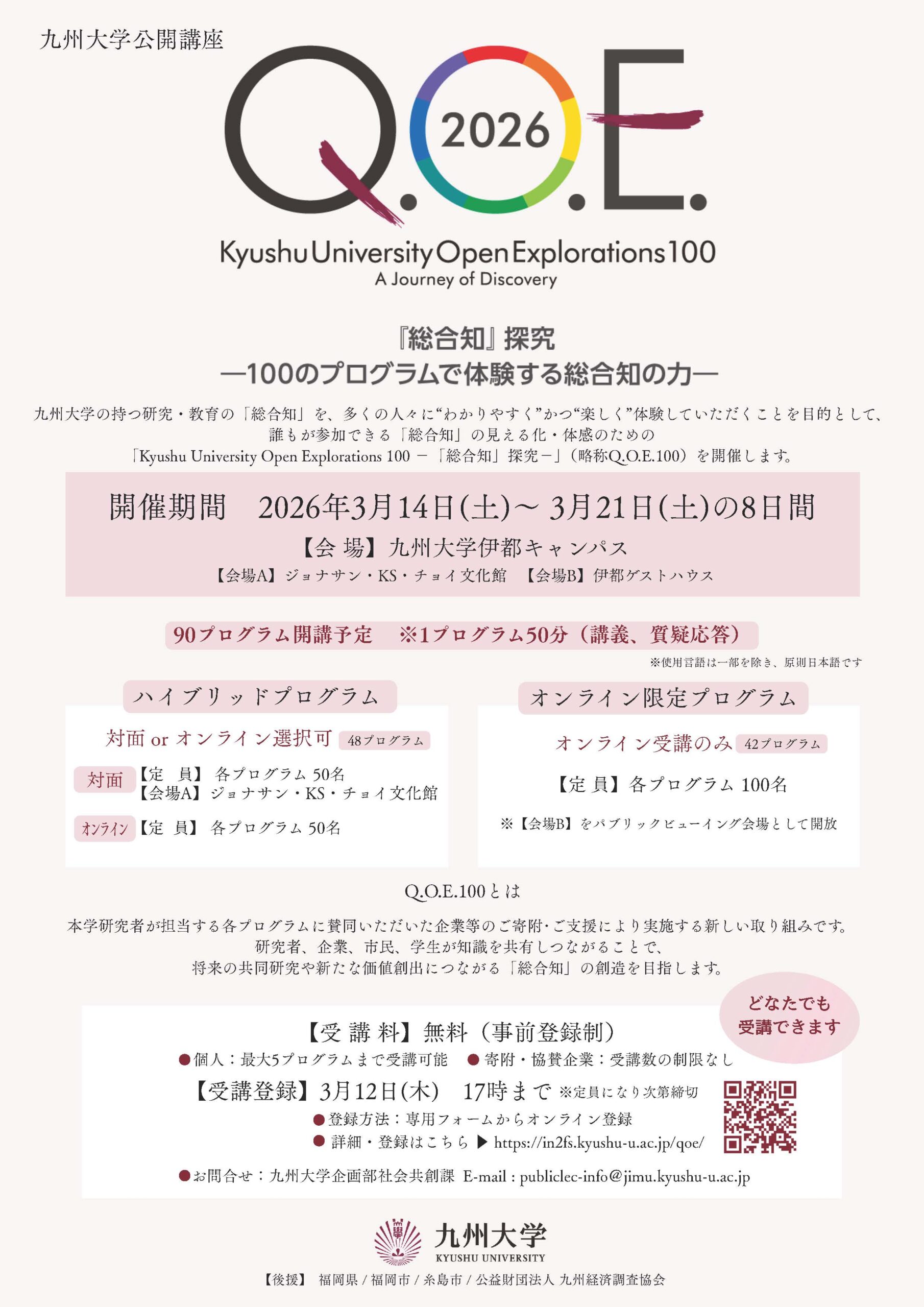 九州大学の持つ研究・教育の「総合知」を、多くの人々に”わかりやすく”かつ”楽しく”体験していただくことを目的として、企業や市民、学生など誰もが参加できる「総合知」の見える化・体感のための公開講座「Kyushu University Open Explorations 100-『総合知』探究-」(略称 Q.O.E.100)を開催します。