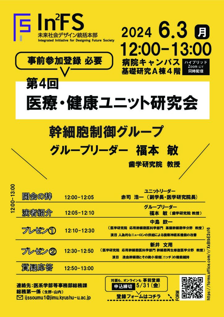本ユニットは、「プレシジョン創薬」「高深度オミクス」「医療情報」「社会変革型データサイエンス」「幹細胞制御」「未来医療」「ニューロサイエンス」の7つのグループで構成しており、今回の研究会では、幹細胞制御グループが取組みについて講演を行います。
