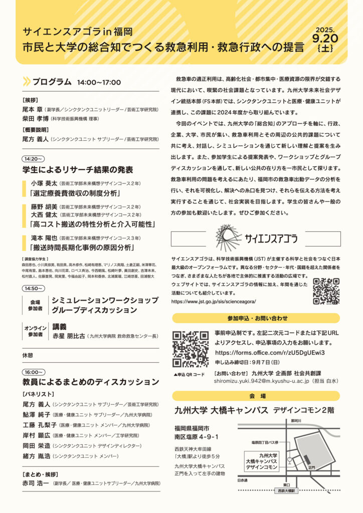今回のイベントでは、九州大学の「総合知」のアプローチを軸に、行政、企業、大学、市民が集い、救急車利用とその周辺の公共的課題について共に考え、対話し、シミュレーションを通じて新しい理解と提案を生み出します。また、参加学生による提案発表や、ワークショップとグループディスカッションを通して、新しい公共の在り方を一市民として探ります。救急車利用の問題を考えるにあたり、福岡市の救急車出動データの分析を行い、それを可視化し、解決への糸口を見つけ、それらを伝える方法を考え実行することを通じて、社会実装を目指します。