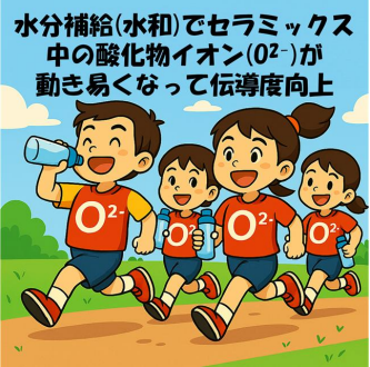 - セラミック材料(Ba7Nb4MoO20)が水を吸い込むと、内部で酸化物イオン(O2–)の移動がより活発になることを発見