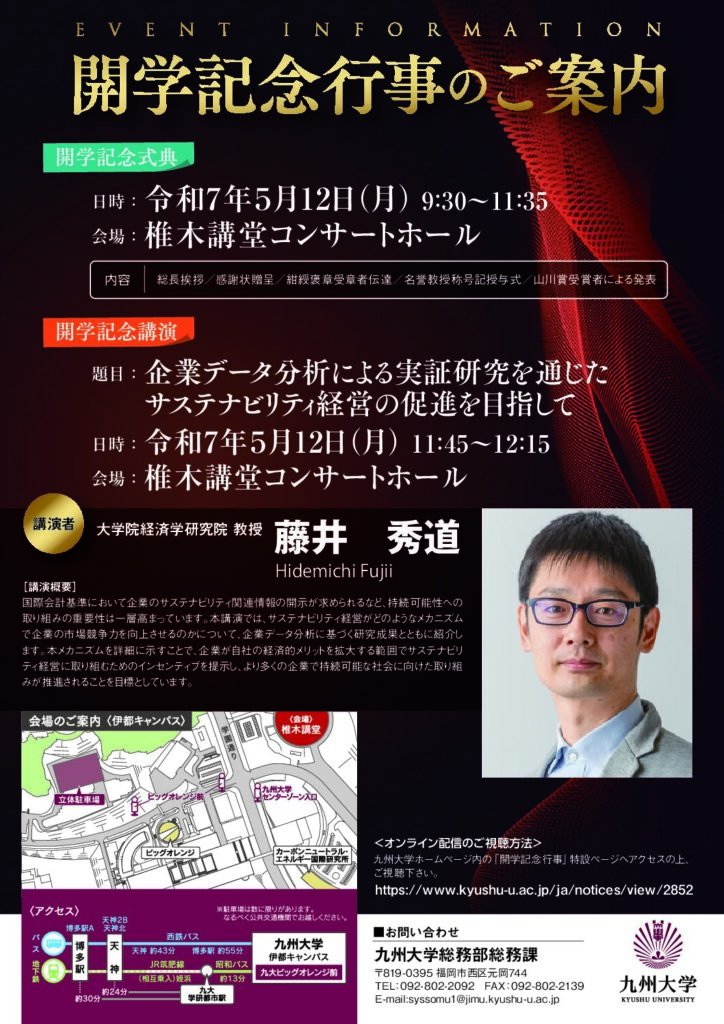環境・食料ユニット 環境経済政策研究グループの藤井 秀道教授(経済学研究院)が、本学の令和7年度開学記念行事の記念講演会で、「企業データ分析による実証研究を通じたサステナビリティ経営の促進を目指して」のテーマで、講演をいたします。詳細は、以下のリンク先をご覧ください。事前申し込みが必要です。