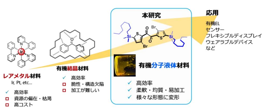 りん光は、有機EL※5やバイオイメージングなどに有用な発光現象の一種です。これまで高効率なりん光を得るには、イリジウムや白金などのレアメタルを使うことが必要と考えられていましたが、レアメタルは安定供給に課題があります。また、有機分子でも、結晶状態であれば高効率なりん光を示す例が報告されていましたが、自由な形態をとることができる液体状態の有機分子では、高効率なりん光を得ることは困難でした。