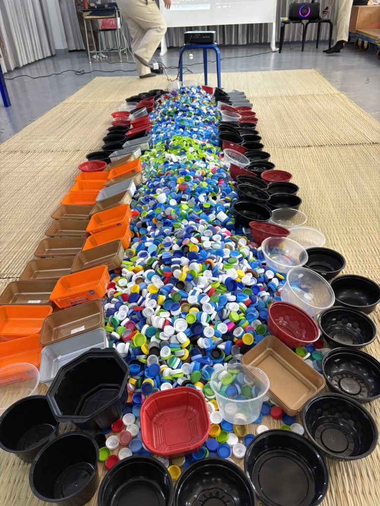 Precious Plasticでは、ペットボトルキャップの再生利用に関するワークショップに参加した。キャップの分別から加工までの工程を体験する中で、マクロプラスチックごみの種類や特性に関する理解を深めるとともに、分別作業の煩雑さと重要性を実感した。
